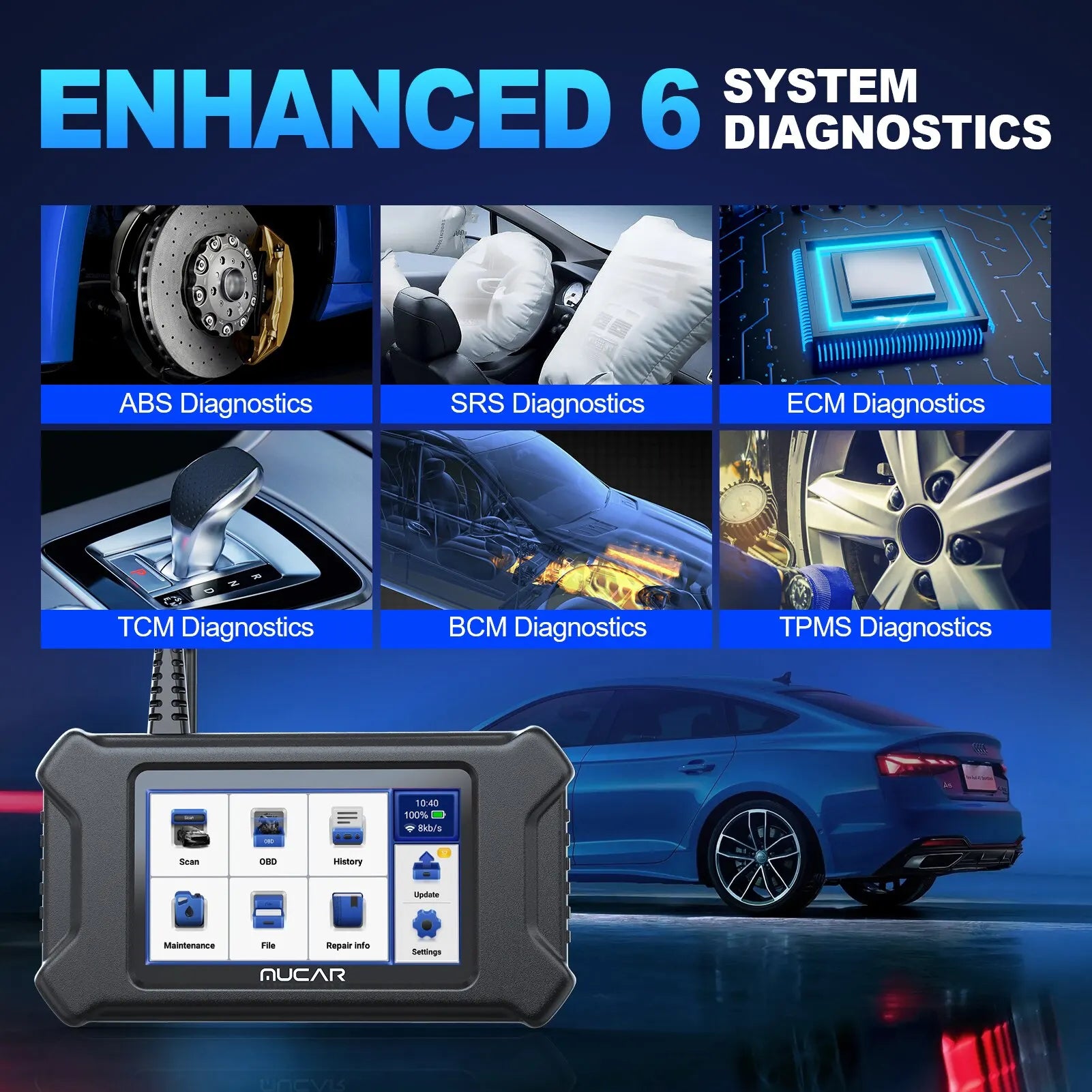 • 6 System Code Read :Read codes for 6 different systems, including ABS, SRS, TCM, ECM, and TPMS.