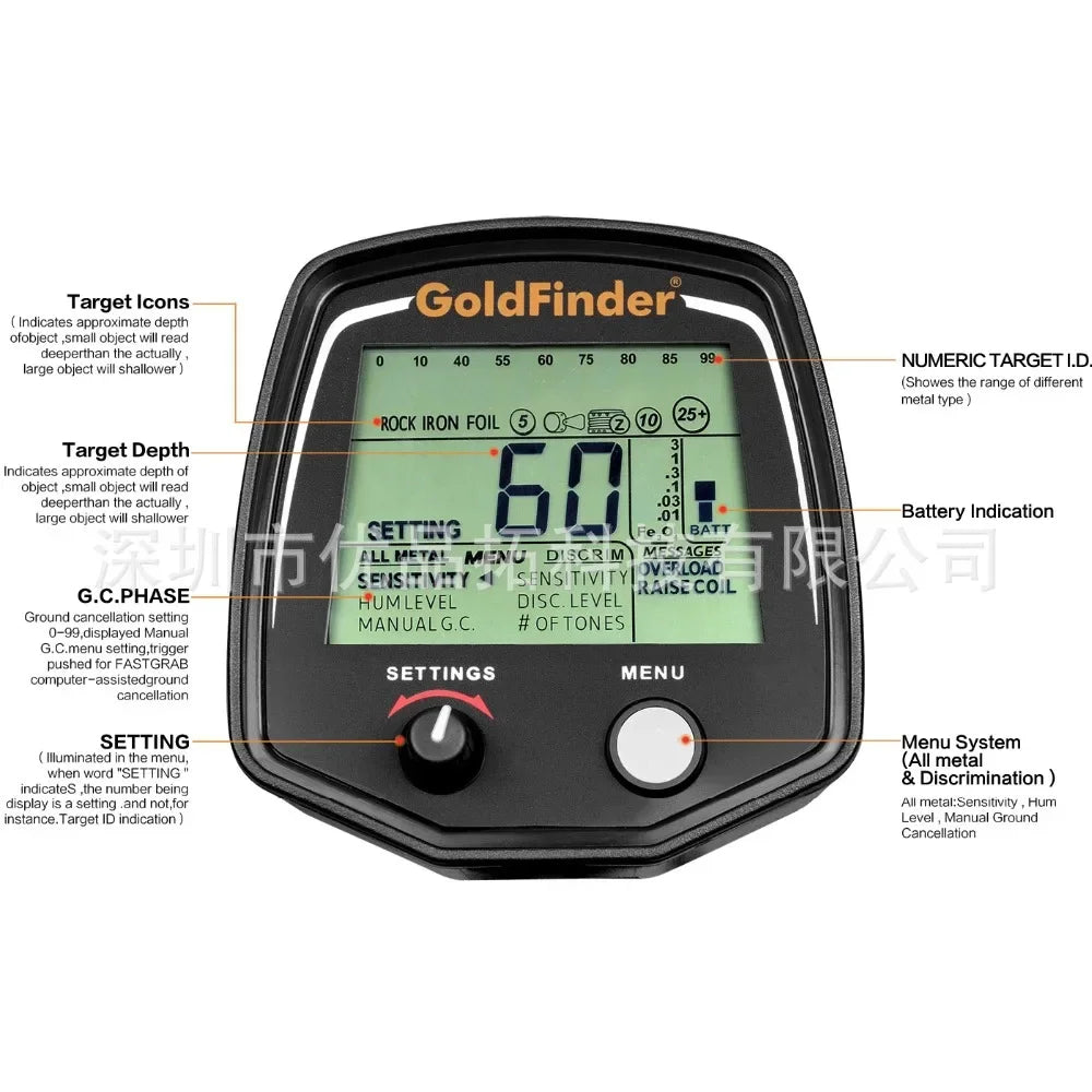 1. High performance: multi-purpose, high-performance, computerized metal detector. It has high sensitivity and ground balance control ability, especially in gold detection. The trace detection under difficult conditions has good discrimination. When detecting coins, the visible target ID can be used as a powerful reference. GF2 works at 13KHZ frequency and has good performance on gold, jewelry and coins. GF2 comes with an 11 inch detection disk for maximum detection depth.